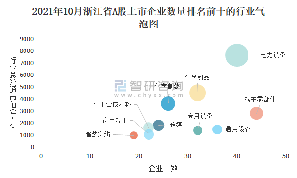 2021年10月浙江省A股上市企業(yè)數(shù)量排名前十的行業(yè)氣泡圖