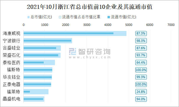 2021年10月浙江省總市值前10企業(yè)及其流通市值