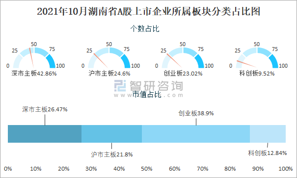 2021年10月湖南省A股上市企業所屬板塊分類占比圖