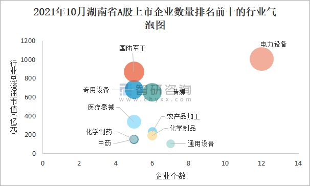 2021年10月湖南省A股上市企業數量排名前十的行業氣泡圖
