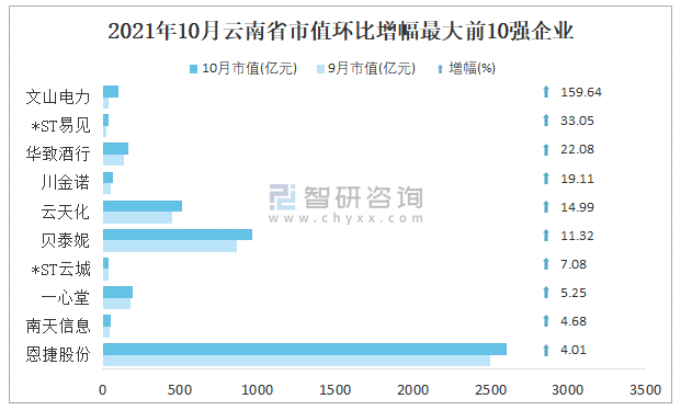 據同花順統計數據可知:相較于2021年9月,云南省10月有14家企業總市值呈現不同程度的增長,1家企業增幅超過50%,其中從事電力行業的文山電力增幅最大,增長159.64%,環比增幅最大的前10強企業中,從事電力設備行業的恩捷股份增量最大,總市值增加100.19億元;26家企業總市值環比出現下滑。
