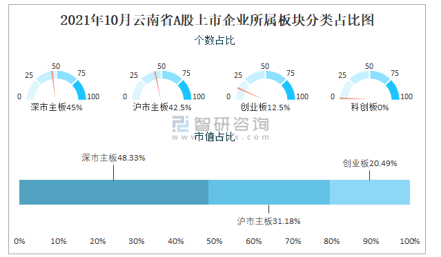 據同花順統計數據可知:截止至2021年10月31日,云南省A股上市企業中在深市主板上市的企業數量最多且總市值最高,共計18家企業在深市主板上市,占全省A股上市企業數量比重為45%,其總市值共計5335.3億元,占全省A股上市企業總市值比重為48.33%,云南省暫無企業在科創板上市。