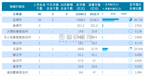 據同花順統計數據可知:截止至2021年10月31日,云南省的A股上市企業共計40家,上市企業數量排名全國第21,總市值共計11040.3億元;除紅河哈尼族彝族自治州、德宏傣族景頗族自治州、昭通市、楚雄彝族自治州、西雙版納傣族自治州、怒江傈僳族自治州6個地級行政區以外,云南省其他10個地級行政區均有企業在A股上市,其中昆明市上市企業數量最多,為29家;云南省的A股上市千億市值企業數量在全國排名第11,共計3家,分布在昆明市、玉溪市2個地區,其中昆明市千億市值企業最多,為2家;昆明市A股上市企業總市值和總流通市值均為最高。
