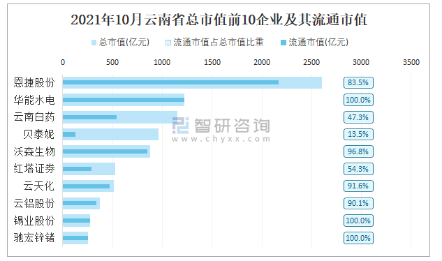 2021年10月云南省總市值前10企業及其流通市值