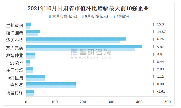 據同花順統計數據可知:相較于2021年9月,甘肅省10月有9家企業總市值呈現不同程度的增長,其增幅均低于50%,其中從事飲料制造行業的蘭州黃河增幅最大,增長15.3%,環比增幅最大的前10強企業中,從事鋼鐵行業的方大炭素增量最大,總市值增加22.69億元;24家企業總市值環比出現下滑,其中包括增幅排名前10的讀者傳媒。