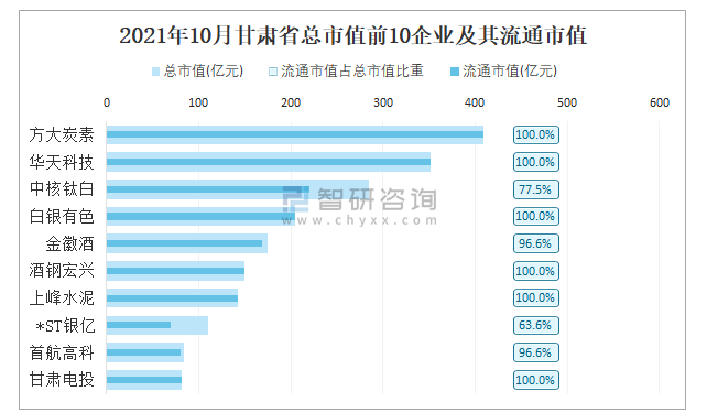 2021年10月甘肅省總市值前10企業及其流通市值