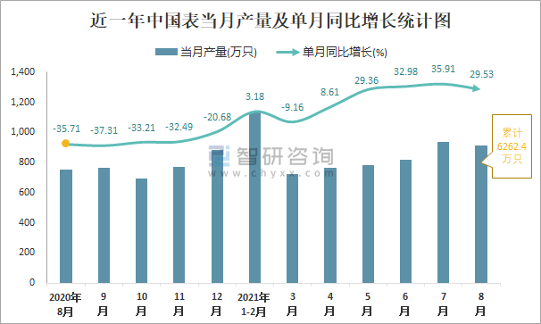 根據(jù)國家統(tǒng)計局數(shù)據(jù)顯示:2021年8月中國表產量為915萬只,同比增長29.53%;2021年1-8月中國表累計產量為6262.4萬只,同比增長15.48%;2015-2020年中國表產量2016年達到最高,此后逐年遞減。