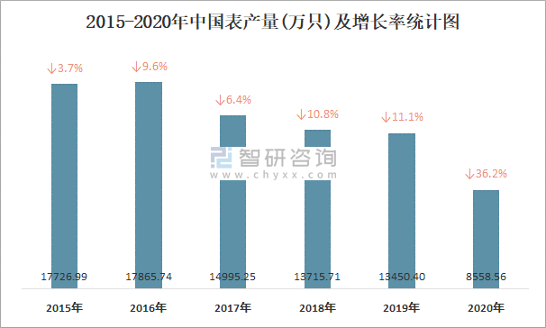2015-2020年中國表產量及增長率統(tǒng)計圖