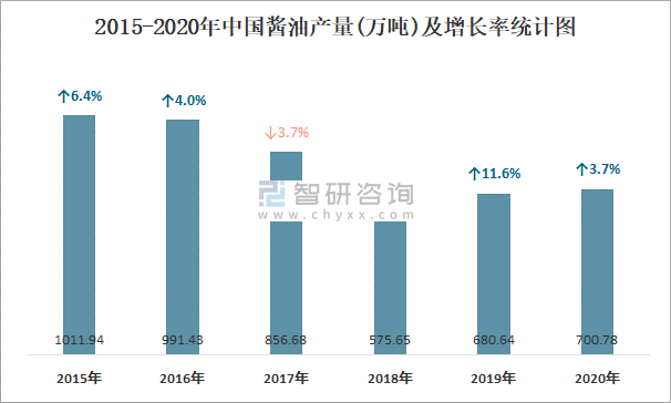 2015-2020年中國醬油產量及增長率統計圖