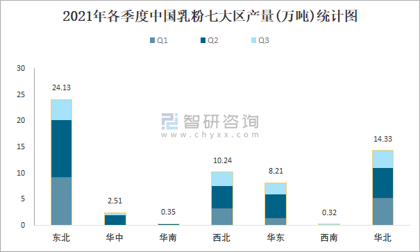 2021年各季度中國乳粉七大區產量統計圖