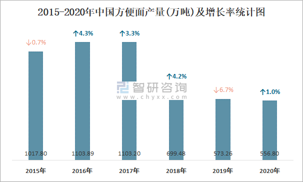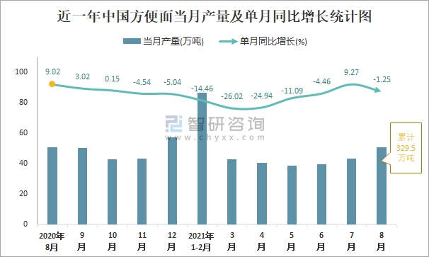 根據國家統計局數據顯示:2021年8月中國方便面產量為50.8萬噸,同比下降1.25%;2021年1-8月中國方便面累計產量為329.5萬噸,同比下降8.18%;2015-2020年中國方便面產量2016年達到最高,此后逐年遞減。
