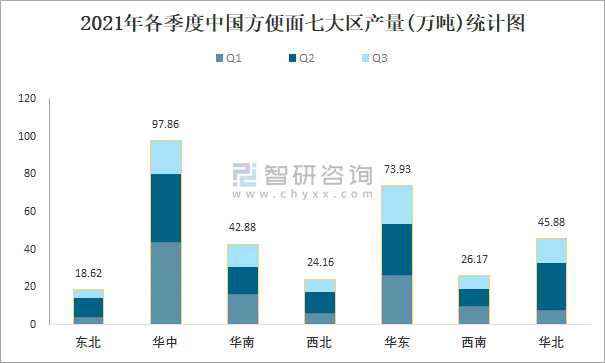 根據國家統計局數據顯示:2021年各季度(第三季度目前暫只統計7月和8月數據)中國方便面主要集中在華中、華東、華北地區生產;2021年1-8月中國方便面產量大區分布相對均衡,其中華中地區產量最高,特別是河南省貢獻了最多產量;2021年1-8月中國方便面各省產量top1遙遙領先于其他前9名。