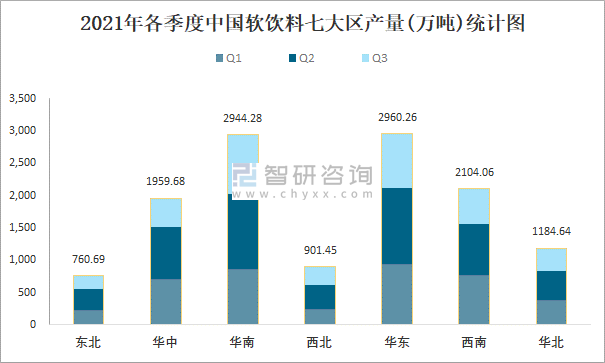 2021年各季度中國軟飲料七大區產量統計圖
