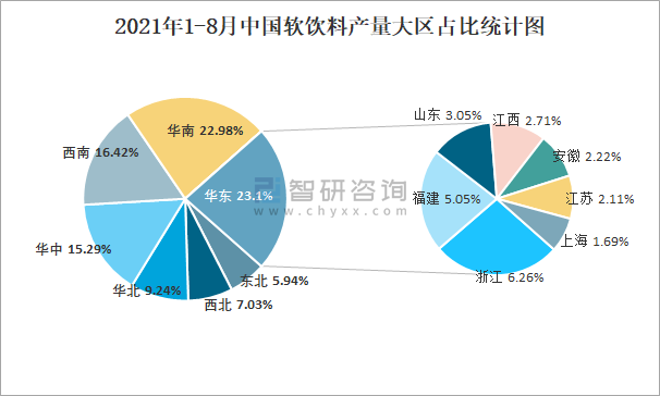 2021年1-8月中國軟飲料產量大區占比統計圖