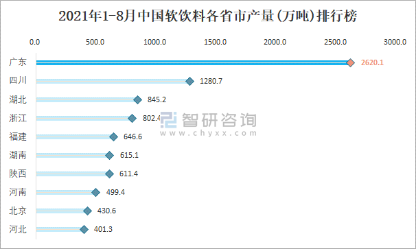2021年1-8月中國軟飲料各省市產量排行榜
