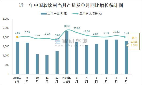 根據國家統計局數據顯示:2021年8月中國軟飲料產量為1791萬噸,同比增長1.74%;2021年1-8月中國軟飲料累計產量為12815.1萬噸,同比增長14.27%;2015-2020年中國軟飲料產量2018年跌至最低,次年大幅度上升。