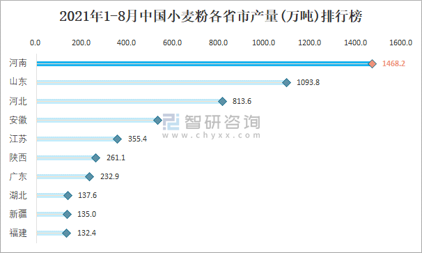 2021年1-8月中國小麥粉各省市產(chǎn)量排行榜