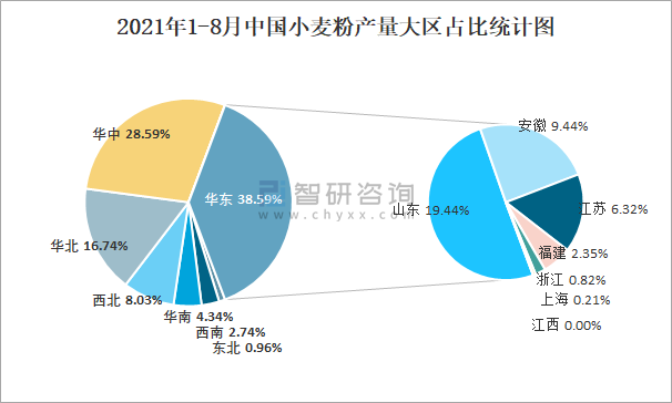 2021年1-8月中國小麥粉產(chǎn)量大區(qū)占比統(tǒng)計圖