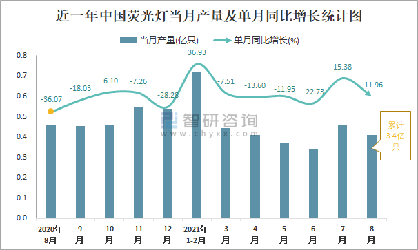 根據(jù)國家統(tǒng)計局數(shù)據(jù)顯示:2021年8月中國熒光燈產(chǎn)量為0.4億只,同比下降11.96%;2021年1-8月中國熒光燈累計產(chǎn)量為3.4億只,同比增長5.06%;2015-2020年中國熒光燈產(chǎn)量2015年達到最高,此后逐年遞減。