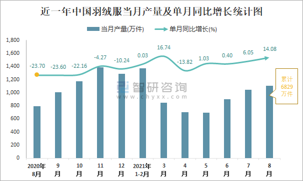 根據(jù)國(guó)家統(tǒng)計(jì)局?jǐn)?shù)據(jù)顯示:2021年8月中國(guó)羽絨服產(chǎn)量為1104萬(wàn)件,同比增長(zhǎng)14.08%;2021年1-8月中國(guó)羽絨服累計(jì)產(chǎn)量為6829萬(wàn)件,同比增長(zhǎng)1.88%;2015-2020年中國(guó)羽絨服產(chǎn)量2015年達(dá)到最高,此后逐年遞減。