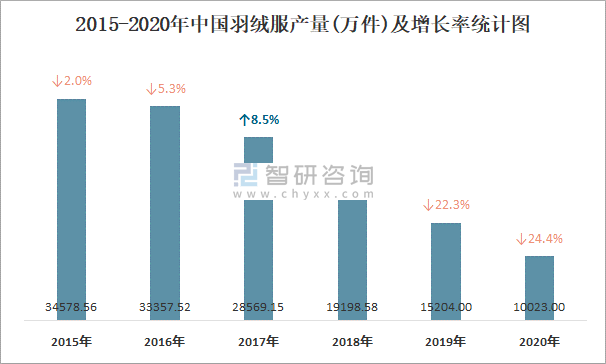 2015-2020年中國(guó)羽絨服產(chǎn)量及增長(zhǎng)率統(tǒng)計(jì)圖