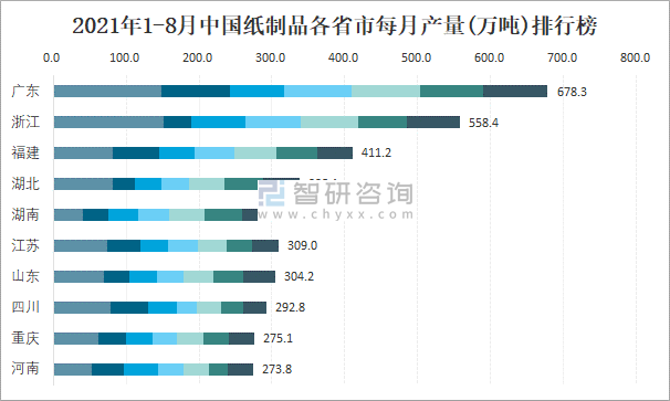 2021年1-8月中國紙制品各省市每月產量排行榜