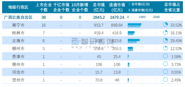 2021年10月廣西壯族自治區各地級市A股上市企業情況統計表