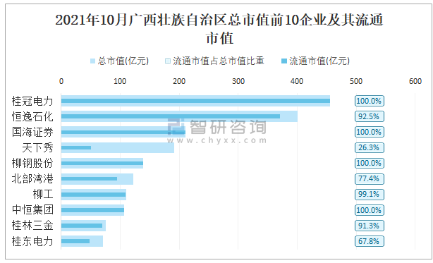 2021年10月廣西壯族自治區總市值前10企業及其流通市值