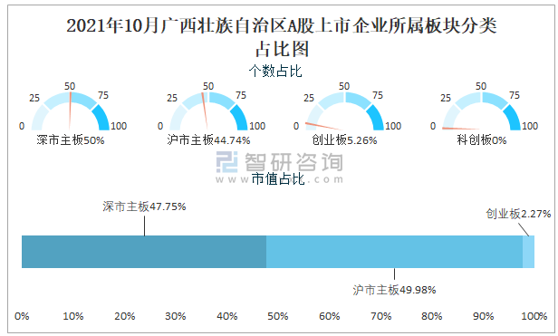 2021年10月廣西壯族自治區A股上市企業所屬板塊分類占比圖