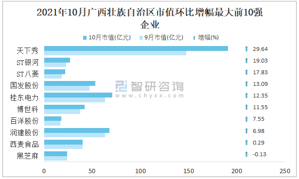 2021年10月廣西壯族自治區市值環比增幅最大前10強企業