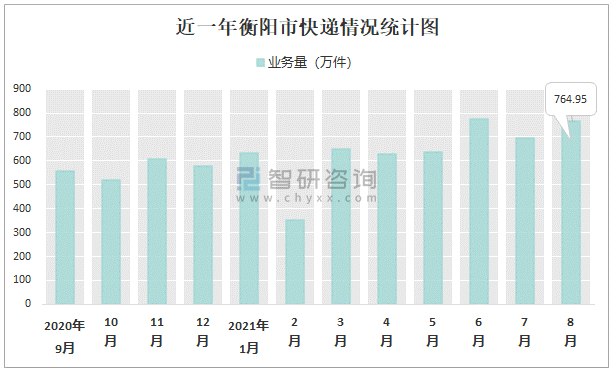 根據各省市郵政局數據可知:2021年8月衡陽市快遞業務量為764.95萬件;2021年1-8月衡陽市快遞累計業務量為5133.51萬件,同比增長32.24%;2016-2020年衡陽市快遞業務量2017年跌至最低,此后逐年遞增。