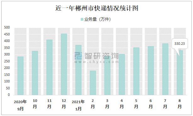 根據(jù)各省市郵政局?jǐn)?shù)據(jù)可知:2021年8月郴州市快遞業(yè)務(wù)量為330.23萬件;2021年1-8月郴州市快遞累計業(yè)務(wù)量為2567.89萬件,同比增長43.01%;2016-2020年郴州市快遞業(yè)務(wù)量逐年遞增。