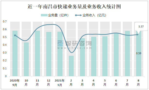 近一年南昌市快遞業(yè)務量及業(yè)務收入統計圖