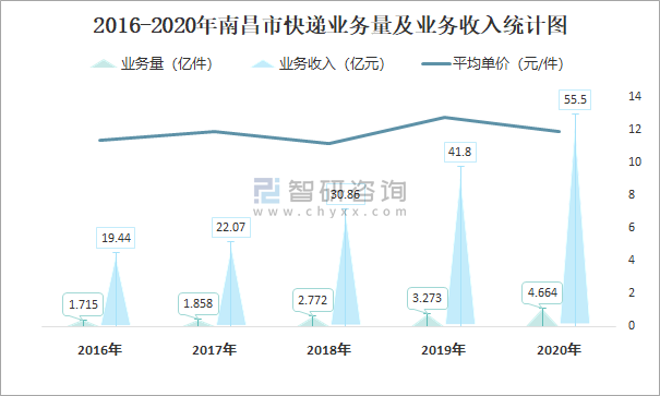 2016-2020年南昌市快遞業(yè)務量及業(yè)務收入統計圖
