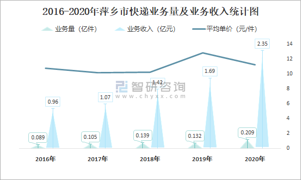 2016-2020年萍鄉市快遞業務量及業務收入統計圖