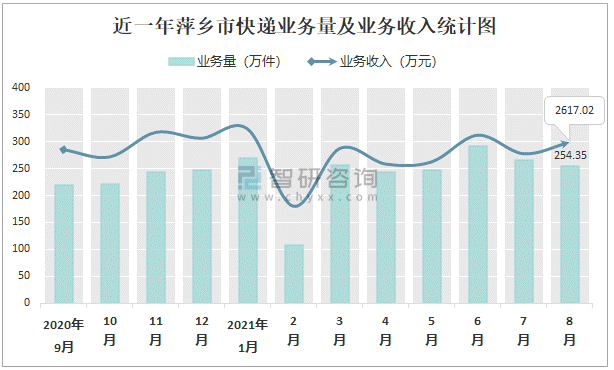 近一年萍鄉市快遞業務量及業務收入統計圖