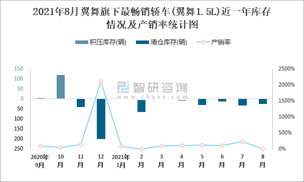 根據中國汽車工業協會數據統計可知:2021年8月翼舞(轎車)旗下只有1款翼舞1.5L轎車在銷售;近一年翼舞1.5L共清倉庫存245輛,其產銷率存在一定幅度波動,2020年12月產銷率最高(2110%),清倉庫存201輛,2020年10月產銷率偏低(51.24%),積壓庫存118輛。