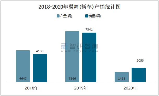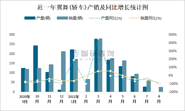 根據中國汽車工業協會數據可知:2021年8月翼舞(轎車)產量為0輛,同比下降100%,銷量為25輛,同比下降85.9%,當月產銷率為0;2021年1-8月翼舞(轎車)累計產量為904輛,同比下降5.1%,累計銷量為1030輛,同比下降29.3%,累計產銷率為113.94%;2018-2020年翼舞(轎車)產銷量均在2019年達到最高值,此后大幅度下滑,且近3年總產量大于總銷量,積壓了庫存142輛。