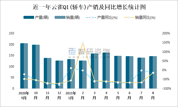 根據(jù)中國汽車工業(yè)協(xié)會數(shù)據(jù)可知:2021年8月云雀Q1(轎車)產量為146輛,同比下降12.6%,銷量為146輛,同比下降12.6%,當月產銷率為100%;2021年1-8月云雀Q1(轎車)累計產量為1154輛,同比下降43.6%,累計銷量為1154輛,同比下降54.6%,累計產銷率為100%;2018-2020年云雀Q1(轎車)產銷量均在2019年達到最高值,此后有所下滑,且近3年總銷量等于總產量,無積壓庫存,庫存管理良好;2021年8月云雀Q1(轎車)旗下只有1款云雀Q11.4L轎車在銷售。