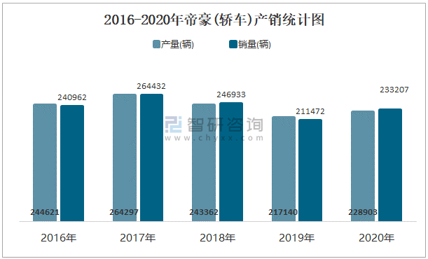 根據中國汽車工業協會數據可知:2021年8月帝豪(轎車)產量為13701輛,同比下降29.3%,銷量為14362輛,同比下降31.7%,當月產銷率為104.82%;2021年1-8月帝豪(轎車)累計產量為125764輛,同比下降9.9%,累計銷量為123964輛,同比下降13.3%,累計產銷率為98.57%;2016-2020年帝豪(轎車)產銷量均在2019年跌至最低值,此后小幅度回升,且近5年總產量大于總銷量,積壓了庫存1317輛。