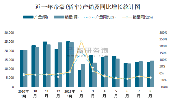近一年帝豪(轎車)產銷及同比增長統計圖