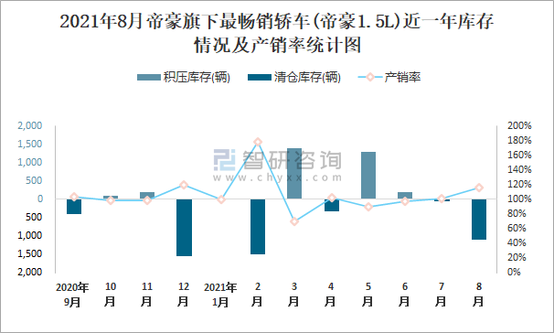 2021年8月帝豪旗下最暢銷車(帝豪1.5L)近一年庫存情況及產銷率統計圖