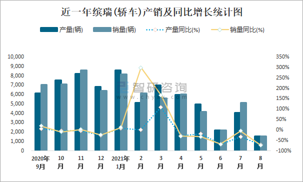 根據中國汽車工業(yè)協會數據可知:2021年8月繽瑞(轎車)產量為1544輛,同比下降70.9%,銷量為1538輛,同比下降72.2%,當月產銷率為99.61%;2021年1-8月繽瑞(轎車)累計產量為39455輛,同比下降10.9%,累計銷量為38963輛,同比下降9.9%,累計產銷率為98.75%;2018-2020年繽瑞(轎車)產銷量均在2019年達到最高值,此后有所下滑,且近3年總產量大于總銷量,積壓了庫存1593輛。