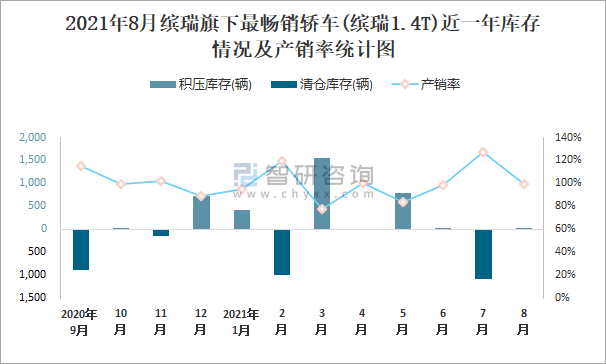 2021年8月繽瑞旗下最暢銷車(繽瑞1.4T)近一年庫存情況及產銷率統計圖