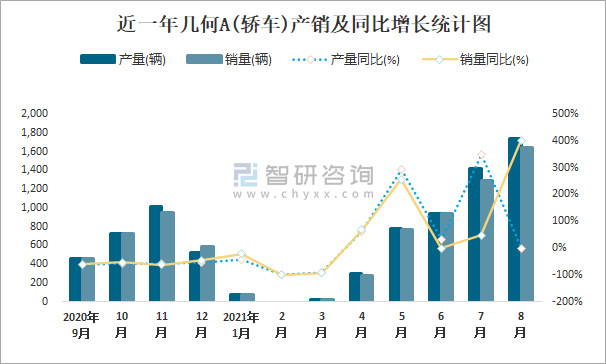 根據(jù)中國汽車工業(yè)協(xié)會數(shù)據(jù)可知:2021年8月幾何A(轎車)產(chǎn)量為1736輛,同比下降0%,銷量為1639輛,同比增長402.8%,當月產(chǎn)銷率為94.41%;2021年1-8月幾何A(轎車)累計產(chǎn)量為5280輛,同比增長130.1%,累計銷量為5028輛,同比增長116.6%,累計產(chǎn)銷率為95.23%;2019-2020年幾何A(轎車)產(chǎn)銷量大幅度下降,且近2年總銷量等于總產(chǎn)量,無積壓庫存,庫存管理良好。
