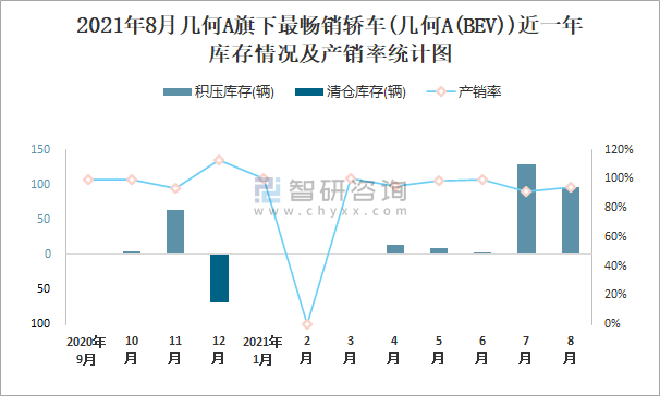 2021年8月幾何A旗下最暢銷車(幾何A(BEV))近一年庫存情況及產(chǎn)銷率統(tǒng)計圖