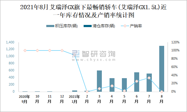 2021年8月艾瑞澤GX旗下最暢銷車(艾瑞澤GX1.5L)近一年庫存情況及產銷率統計圖