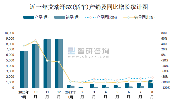 根據中國汽車工業協會數據可知:2021年8月艾瑞澤GX(轎車)產量為1296輛,同比下降82.2%,銷量為0輛,同比下降100%,當月產銷率為0%;2021年1-8月艾瑞澤GX(轎車)累計產量為4699輛,同比下降89.4%,累計銷量為898輛,同比下降98%,累計產銷率為19.11%;2018-2020年艾瑞澤GX(轎車)產銷量逐年遞增,且近3年總產量大于總銷量,積壓了庫存59輛。
