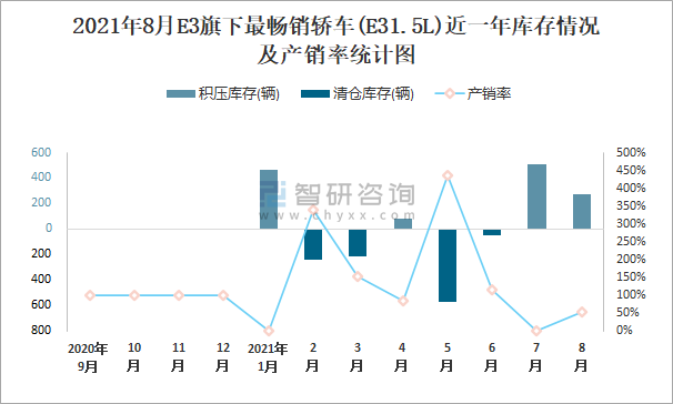 2021年8月E3旗下最暢銷車(E31.5L)近一年庫存情況及產銷率統計圖