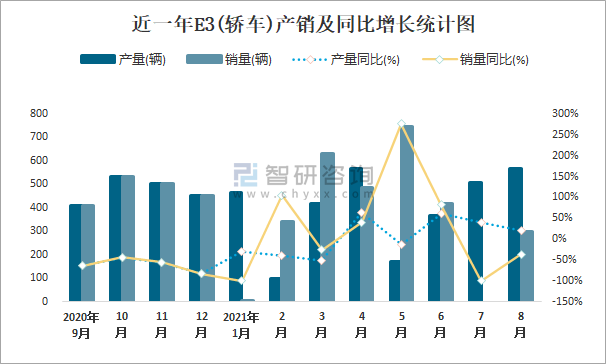根據中國汽車工業協會數據統計可知:2021年8月E3(轎車)旗下只有1款E31.5L轎車在銷售;近一年E31.5L共積壓庫存245輛,其產銷率存在一定幅度波動,2021年5月產銷率最高(435.67%),清倉庫存574輛,2021年1月產銷率偏低(0.21%),積壓庫存465輛。